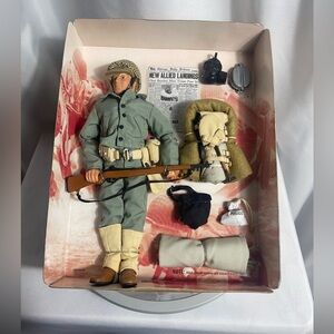 Honor history with this vintage 1997 G.I. Joe D-Day Salute from the Classic Collection by Kenner and Hasbro. This limited edition figure is the first in a holiday series and features a full WWII military uniform, accessories, and an authentic reproduction of a 1944 Chicago Tribune newspaper. Includes M-1 rifle, bedroll, helmet with netting, gas mask, entrenching tool, and more (full equipment list on box).
