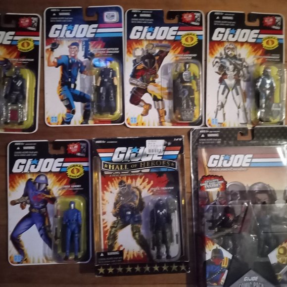 from top left. Firefly, Cobra Flint, Battle Armor Cobra Commander, from bottom right 2pk Destro & Iron Gernaider, Hall of heros Snake eyes and Cobra Commander blue suit. questions welcome more pics upon my request.