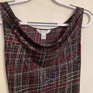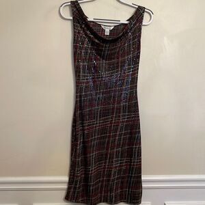 Super fun, loose neckline, sleeveless, unlined dress. Dry clean only.