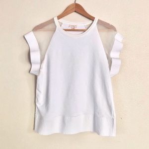 Resort 2014 collection. Silk contrast trim. sheer shoulder detail. classic t-shirt silhouette. 100% silk trim. 100% cotton body. short sleeves. Great used condition