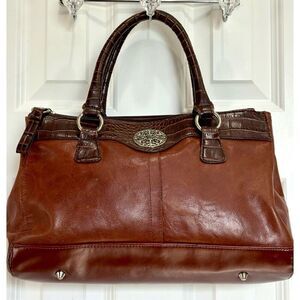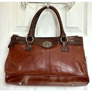 A gorgeous satchel, but with issues, this is Giani Bernini's Double Zip Glazed Leather Satchel in Espresso. It has faux leather croco-embossed trim and handles. She's 14" x 8.75" x 5.5", with dual rolled handles with a drop of 5". Silver-tone hardware, including GB logo medallion on front, handle rings and footed bottom. The back of the bag has a three-quarter sized slip compartment with magnetic snap closure and a zippered compartment with decorative zipper pull. Main entry has double magnetic snap openings. This bag is full of compartments. Two full sized zippered sections (with decorative zipper pulls) flank the main section. Interior has matching sateen lining, Giani Bernini logo plaque, zippered compartment, two slip pockets and clear ID window. This is a beautiful satchel with no structural issues. But please note there are scratches in the leather and the corners are worn (see photos). Handles are in perfect condition.