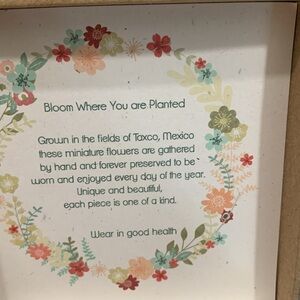 These miniature flowers are forever preserved to be worn and enjoyed every day of the year. Each piece is one of a kind. Set in sterling silver. Rhodium plated for lasting shine. Available in Multi, Blue or Purple