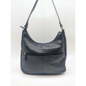 Solid color in smooth leather with lots of pockets and compartments to help you stay organized. Medium hobo style.