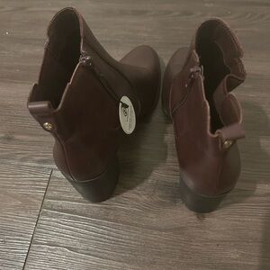 Giani Bernini Women's Korma Leather Almond Toe Ankle Chelsea. Color is “Oxblood.” Shaft measures approximately 4” from arch, inside zip closure and platform is approximately 0.25” with approximately 3.25 inch block heel.