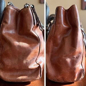 A gorgeous satchel, but with issues, this is Giani Bernini's Double Zip Glazed Leather Satchel in Espresso. It has faux leather croco-embossed trim and handles. She's 14" x 8.75" x 5.5", with dual rolled handles with a drop of 5". Silver-tone hardware, including GB logo medallion on front, handle rings and footed bottom. The back of the bag has a three-quarter sized slip compartment with magnetic snap closure and a zippered compartment with decorative zipper pull. Main entry has double magnetic snap openings. This bag is full of compartments. Two full sized zippered sections (with decorative zipper pulls) flank the main section. Interior has matching sateen lining, Giani Bernini logo plaque, zippered compartment, two slip pockets and clear ID window. This is a beautiful satchel with no structural issues. But please note there are scratches in the leather and the corners are worn (see photos). Handles are in perfect condition.