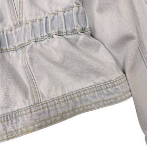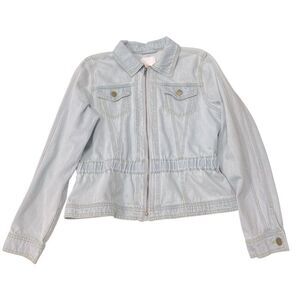 Stylish light blue denim jacket with front pockets and zip closure. Perfect for casual wear.