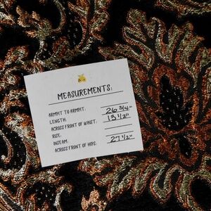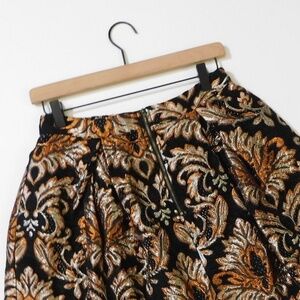 Defined waistband ~ A-line shape with inverted pleats underneath the waist ~ Slightly curved hemline ~ Mini length ~ Exposed back zipper closure ~ Fully lined ~ Woven brocade style fabric with a texture to the fabric … fabric does not have any stretch ~ Black with a swirly floral print in metallic shades of silver, orange and brown