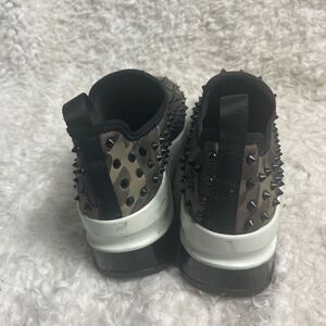 GIANNI BINI NYLON CAMOUFLAGE WEDGE SLIP ON SNEAKERS WITH BLACK SPIKES SZ9.pre owned in good used condition some transfer marks on the white wedge see all pictures any questions please message.G2