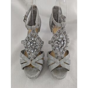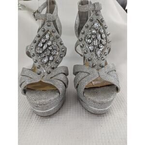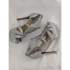 From Gianni BINI, these silver textured lame platform stiletto heels, sandals, are sparkly with rhinestone detailing! Silver "bar" accent on platform sole! Size 8M, 5" Heel, 1.75" platform sole, Excellent EUC Condition! *Measurements always available on request!* **ABSOLUTELY GUARANTEED CONDITION OF EUC MINTY-EXCELLENT TO LIKE-NEW, by Lily at @nocd!**