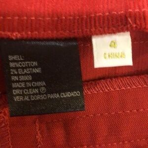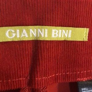 Corduroy wide leg cropped pants in a rich rusty orange. Wear with loafers or boots. Zip, hook and eye inside button closure. Legs are 11” wide. Ornamental pockets on backside. Very small area of loose stitching on left side of back otherwise in very good pre-owned condition. Refer to pictures for imperfections. Gianni Bini. Size 4.