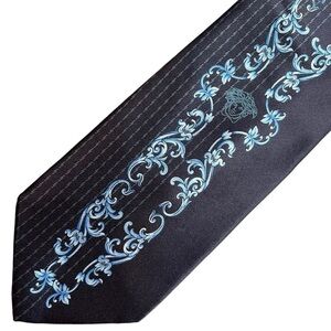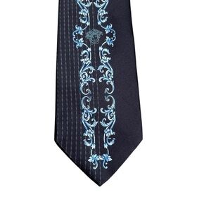 GIANNI VERSACE 90s Vintage Blue Monochromatic Medusa Silk Tie Made in Italy. Men's Rare VERSACE classic neck tie featuring a pointed tip, an adjustable fit and printed Medusa head center print motif.