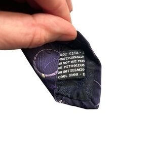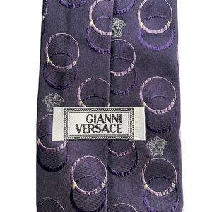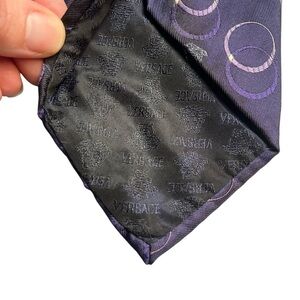 Pre-Death GIANNI VERSACE 90s Vintage Metallic Baroque Silk Medusa Pattern Tie Made in Italy. Purple and silver circular details. Men's Rare VERSACE classic neck tie featuring a pointed tip, an adjustable fit and baroque printed Medusa head geometric allover print motif.