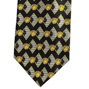 Pre-Death GIANNI VERSACE 90s Vintage Metallic Baroque Silk Medusa Pattern Tie Made in Italy. Black with gold details. Men's Rare VERSACE classic neck tie featuring a pointed tip, an adjustable fit and baroque printed Medusa head geometric allover print motif.