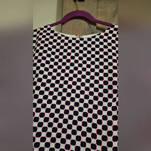 Fun Geometric print. Navy white and hot pink. Pullover shift dress. Top back button closure. Lined. 100% polyester.