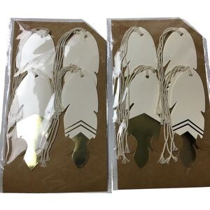 Listing is for 3 sets of gift tags (28 tags total). Includes glitter striped and gold shiny metallic feather-shaped gift tags. The gold is bright and shiny on the feather tags even though the photos make them look dark. Elegant and stylish design. Great to use for gifts, crafts, party favors, organizing & labeling. Each feather tag is approximately 4.25”L x 1.5”W, each striped tag is 3.25”L x 1.75”W.