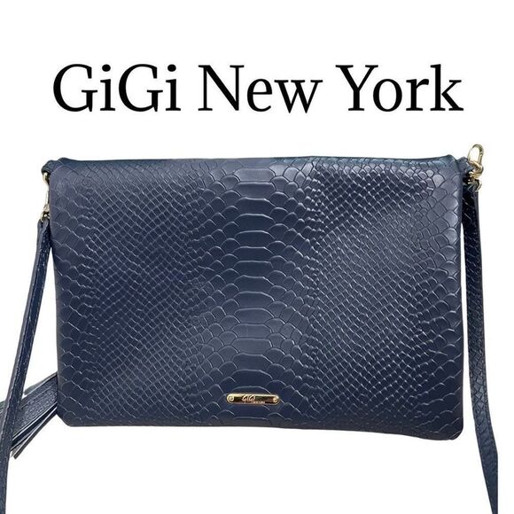 GIGI NEW YORK Navy Embossed Python Leather, Fold over clutch/ crossbody purse