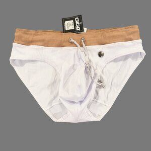 Dive into summer with this stylish and sophisticated GIGO swim brief. This pair of men's swimwear features a sleek white design accented with a fashionable tan waistband. Perfect for swimming, beach trips, or lounging poolside, these briefs combine comfort, support, and modern aesthetics. Brand new with tags!