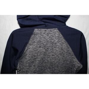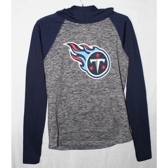 -Features: Tennessee Titans sweatshirt with hoodie, rounded bottom hem line, one exterior front pouch pocket, thumb holes in cuffs, scuba hood without drawstrings, raglan sleeves.