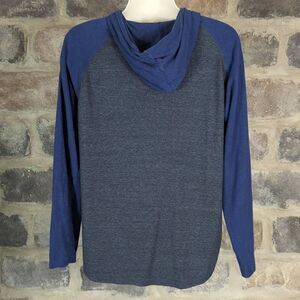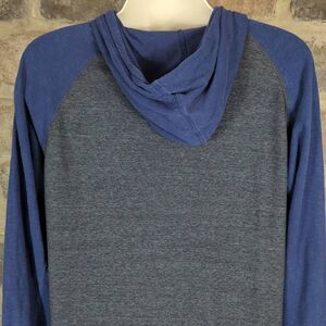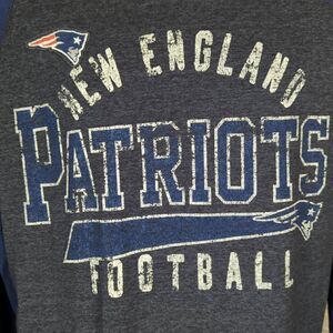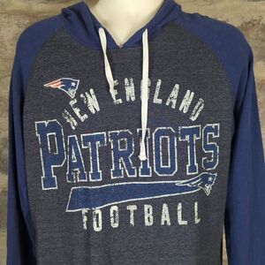 Features: Hooded, Raglan sleeve, New England Patriots graphic, navy blue sleeves & hood, heather gray body, lightweight