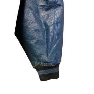 The leather on this vintage jacket shows wear and there is one cut near the wrist. The collar has some soiling on it. Please see the photos for wear.