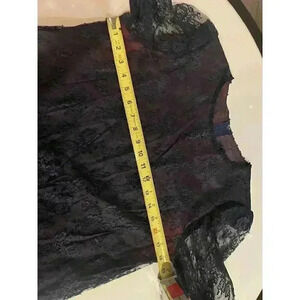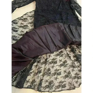 This is the most stunning dress ever. A gorgeous burgundy underlay with navy lace, sheer sleeves, dropped waist, and large 80s glam bow at the drop waist.