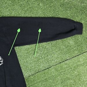 THIS SWEATSHIRT WAS ONLY WORN ONCE AND WASHED. BLEMISHES ARE POINTED OUT ON ONE SLEEVE. THEY ARE HARD TO SEE BECAUSE THEY ARE VERY FAINT, BUT STILL PRESENT.