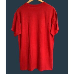 Gildan men's large size, short sleeve, 100% cotton, red t-shirt with graphic front. Ideal for casual wear with a stylish v-neck design.