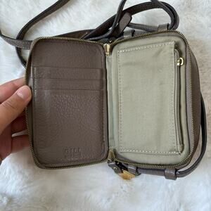 Super cute and practical leather micro crossbody purse by G.I.L.I. with lots of space for your essentials. Mushroom brown color with gold-tone hardware. It is missing the zipper pull on one inside pocket and has some scuffs and signs of wear from general use but is in overall good condition. Measurements are included in photos.
