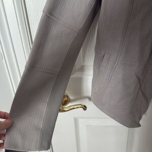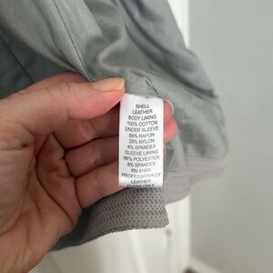 This G.I.L.I. blazer in a neutral gray hue features an elegant asymmetrical waterfall front, offering a modern and sophisticated look. Soft leather and perfect condition. Size 4 with front pockets. Smoke free home.