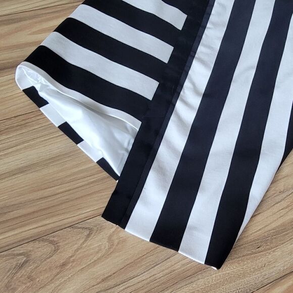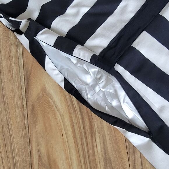Gorgeous ponte knit dress in an asymmetrical stripe pattern. Pointed hemline. Hidden side zip. Fully lined.