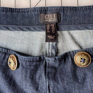 G.I.L.I. Sailor Button Waist Wide Leg Jeans, high waist. Pants have a left side zipper. No pockets. Fabric has stretch.