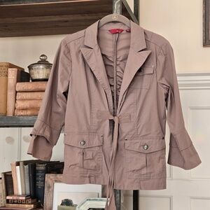 Cute jacket / topper from G.I.L.I (got it love it) in a tan taupe color. Beautiful details throughout - ruching at the back, a tie closure in front or change up the look and leave open, front pockets, slightly flared 3/4 sleeves. Excellent condition. size XS but should be fine for a small or perhaps small medium too. Measurements with it tied in front at it's tightest and without any stretching: Chest measures from side to side about 18.5", waist measures from side to side about 16.5", length measured from shoulder to hem is about 22". Material is 98% cotton, 2% spandex.