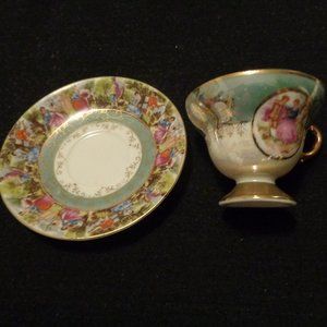 GILTY PLEASURE. THIS IS A AWESOME AND BEAUTIFUL VINTAGE GILT CUP & SAUCER. IT HAS A ROMANTIC COUPLE ON THE CUP AND ON THE SAUCER THE COURT PEOPLE. IT IS MADE TO LOOK LIKE THE PAST PAST. WITH SOME WEAR YET PLENTY TO SHARE WITH YOU LUCKY BUYER. ENJOY THE PAST. 2ND GROUP. THANKS GILTY PLEASURE.
