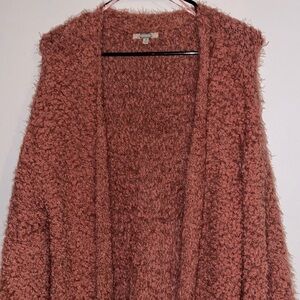 Warm and stylish knit cardigan. Features a hood and pockets. Perfect for layering. Beautiful