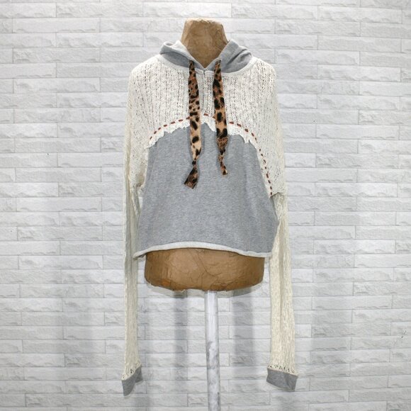 GIMMICKS Sweater Sweatshirt Hoodie Mixed Media Knit Cropped Top Lace Gray Cream