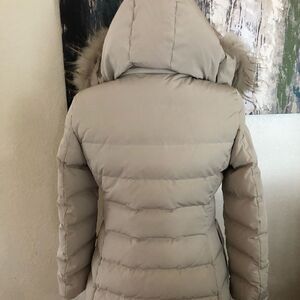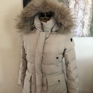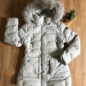GIMO’S 6D180 Light Tan Cream Down Fur Trim Hooded Puffer Jacket Women’s SIZE 44.