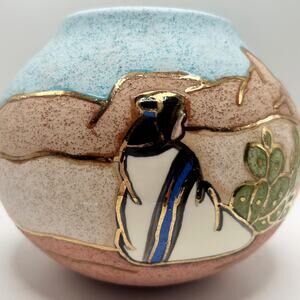 Beautiful Vintage GINA Hand Crafted Native American Pottery piece with 24k Gold trim. This Piece was crafted by the renowned artist Gina and bears her signature. It is hand crafted and painted. It shows a depiction of southwester culture and an indigenous woman sitting while gazing upon the land. It is in amazing shape and shows no signs of heavy wear such as chips, cracks or breaks. It is sure to make a great addition to anyone's collection