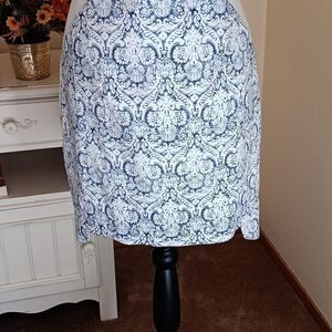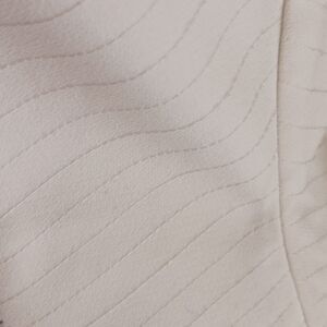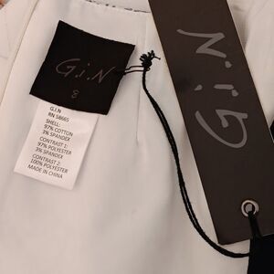 NEW. This beauty is flattering and unique. Soft knit panel in the front and back. Slightly shorter right at the front. Stitched woven fabric on the sides cuts in to create the illusion or a narrower silhouette. Darker trim on the arms. Fully lined. Back zip. Size 8 measures 35 at chest, 28 at waist, 38 at hips. 36 long and 34 in front from shoulder to hem. Lovely and NEW.