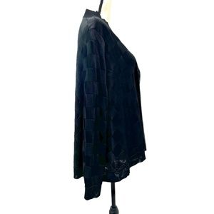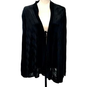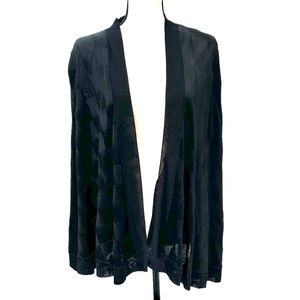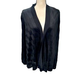 Giorgio Armani black viscose swing trapeze cardigan. A tone on tone checkerboard design is created by alternating the direction of the knit. Very soft, almost silky feel to the knit. It also has a beautiful sheen in the light. There is a band around the front and collar. It is 1.5" wide at the back of the neck and increases to 2" wide down the sides. There is a 2" band around the wrists and around the bottom of the garment. The ties to close the cardigan are inside the band. When closed, the front wraps over itself. The left side is longer than the right. Incredibly elegant and versatile! could be worn with a cocktail dress or jeans and look amazing! In excellent preowned condition.