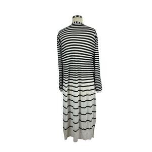 Features v-neck, long sleeves, gradient black and white stripes, side vents, button front, pockets, duster style, lightweight, super soft.