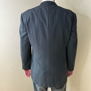 Size 44 Long. Excellent condition. Pure new wool. Charcoal Grey pinstripe suit jacket. No back vent. Model in photos is 5’11”, size 42R, waist 34 so fit will likely differ on a size 44L physique.