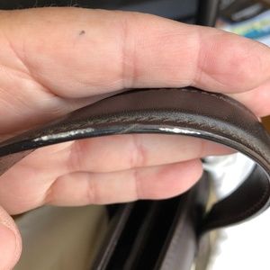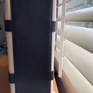 White linen with dark brown leather accents handbag from 2002. Used 2x, then stored. There are a couple of marks on the white and a scratch on the handle. See photos. Single magnet closure. It has what looks like a slight crease on the front side, it came that way - the side with the Armani embossing. Otherwise, the structure of the bag is solid. Would accent any professional outfit perfectly. Armani dust cover bag included.