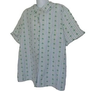 True Vintage - see measurements to ensure fit. Girl Scouts Uniform Shirt, Tagged Size 14 White Cotton-poly blend, washable Stripes with the Girls Scouts logo in the pattern Short sleeves Button front with collar Single pocket Measurements - flat (All measurements in inches) Shoulder, seam to seam - 13.5 Underarm to underarm - 18.5 Length, from center of back (below collar if present) - 21.75 K4