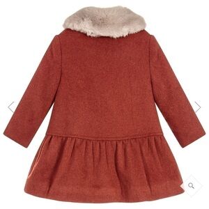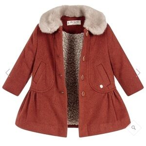 Smart rust brown coat for little girls by luxury Spanish brand Pili Carrera. Made in a soft wool blend, with a chunky fleece lining. It has a faux fur collar and a feminine peplum hem