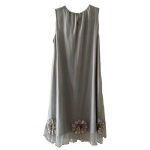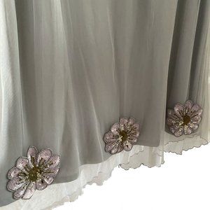 - Features sequined and beaded flowers along the bottom of the dress (also weighs the dress down a bit so the flowy layers won't fly up)