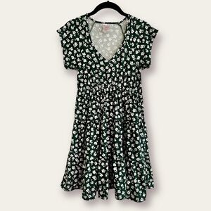 GIRLS GREEN PRINT DRESS. NEW. NEVER WORN. SIZE S(3-5). ELASTIC WAIST.