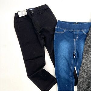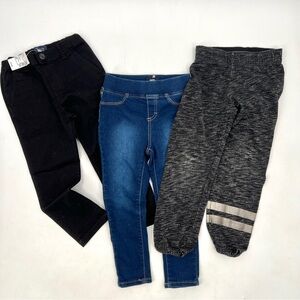 All three items are size 4T, and come together. Great for casualwear or for back to school. The black jeans are new with tag, and the other two items are in good used condition. All three items have a stretchy/adjustable waistband, and would be great for the fall or winter. Please see photographs for measurements and details.