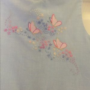Handmade by professional seamstress. Sweet little comfortable one piece outfit. Has appliqué butterflies with delicate embroidery work. Snaps for quick change. Pretty shell buttons on shoulders. In excellent condition from a smoke and pet free home. Please go by measurements, is hard to size.