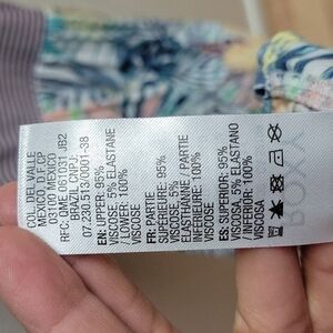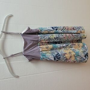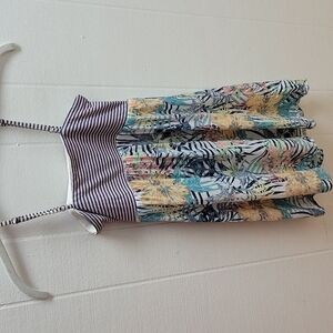 THE DRESS IS AS CUTE AS CAN BE AND MEASURES ABOUT 28 INCHES FROM TOP TO BOTTOM. THE DESIGN HAS A TROPICAL FLAIR TO IT WITH ITS FLOWERS.