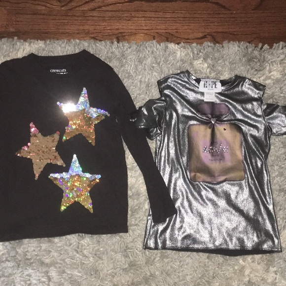 These are size 4/5 toddler. One is from j crew and has flip up sequences. Other is from Hampton’s boutique. Both are only worn one time each . Great condition. Thank he Chanel one is cold shoulder and kinda fancy .